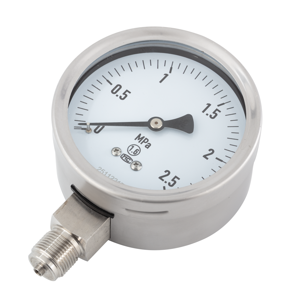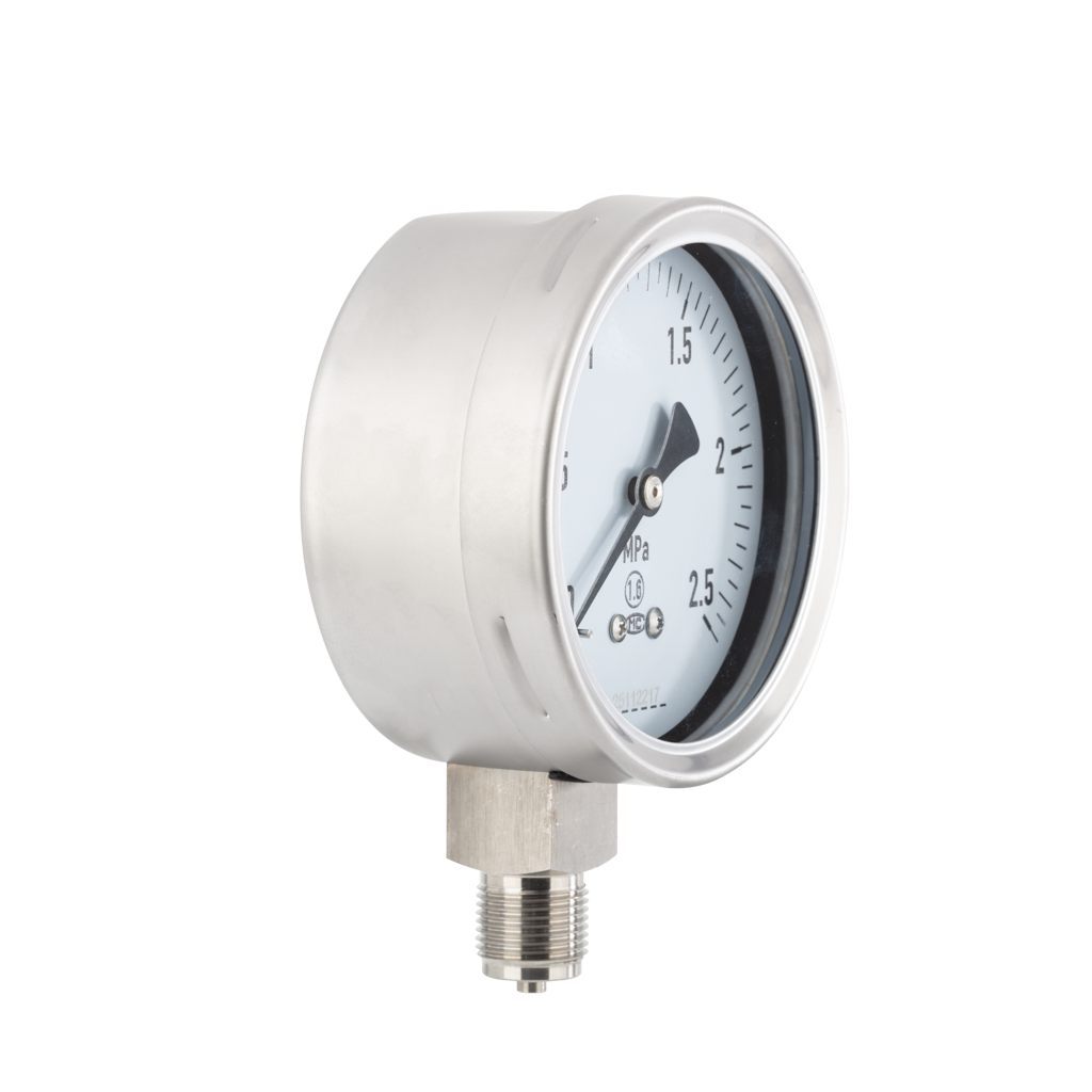 压力表是一种用于测量流体压力的工业仪表,主要通过弹性敏感元件形变实现压力值显示,广泛应用于工业过程控制、食品、制药及防爆等场景。其核心原理基于波登管、膜盒或波纹管等弹性元件受压产生形变,通过机械转换机构驱动指针指示压力值。仪表主要由溢流孔、指针、玻璃面板及防护外壳构成,其中溢流孔可释放超压保护设备,玻璃面板可选强化或防反射材质。根据环境需求分为普通型、耐振型、耐热型及防爆型,并通过IP防护等级区分防尘防水性能。测量范围覆盖-0.1MPa至700MPa,特殊膜盒型可检测低至2.5kPa的微压。仪表连接部采用钎焊或TIG焊接等方式适配不同材质,并可通过禁油/禁水处理满足特殊介质测量需求。部分型号支持接点开关功能,用于压力控制或报警。